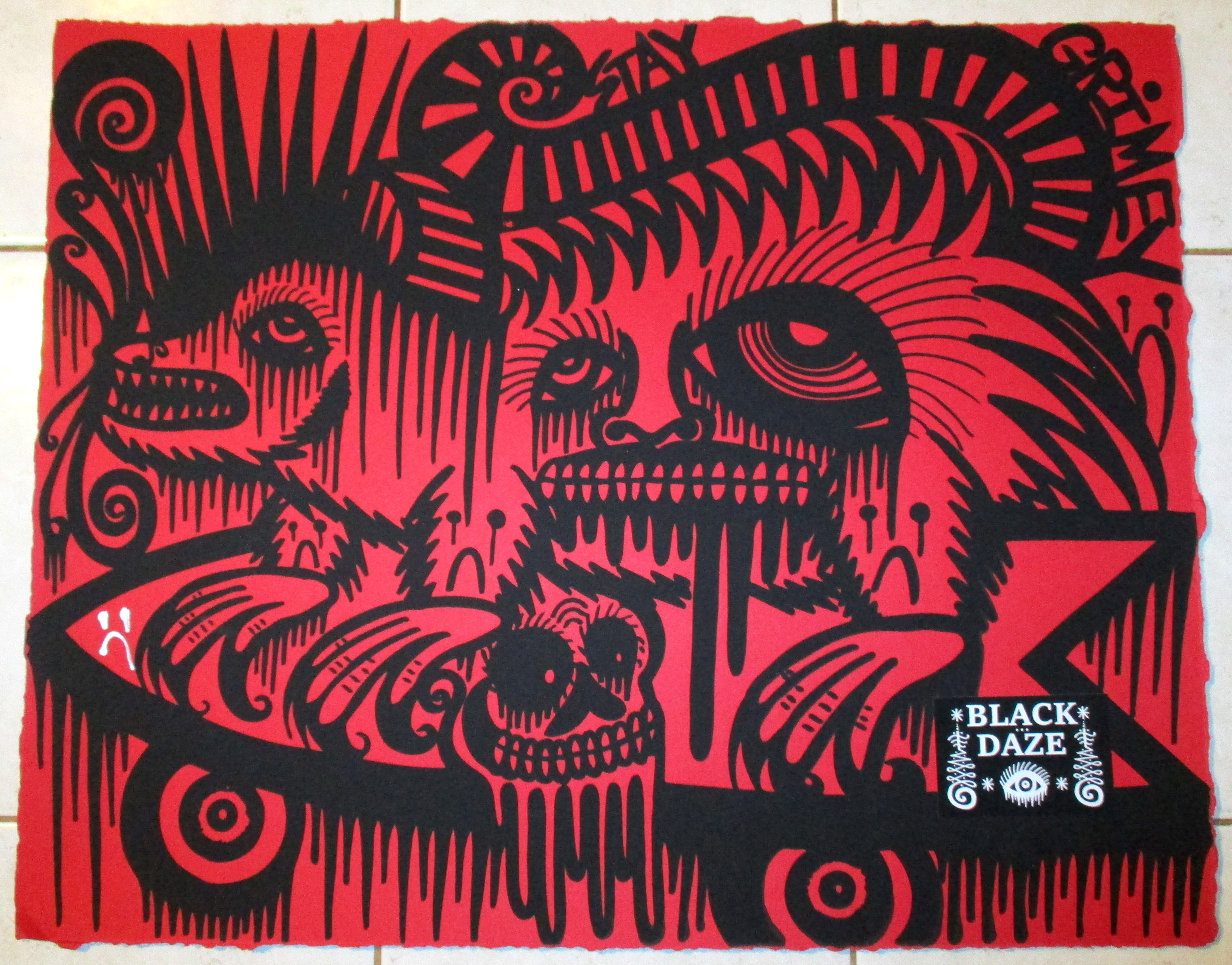SCREEN PRINT *ARTIST- BLACK DAZE* 16 X 20 INCH PAPER COMES IN PROTECTIVE SLEEVE BLACK IMAGE ON RED PAPER