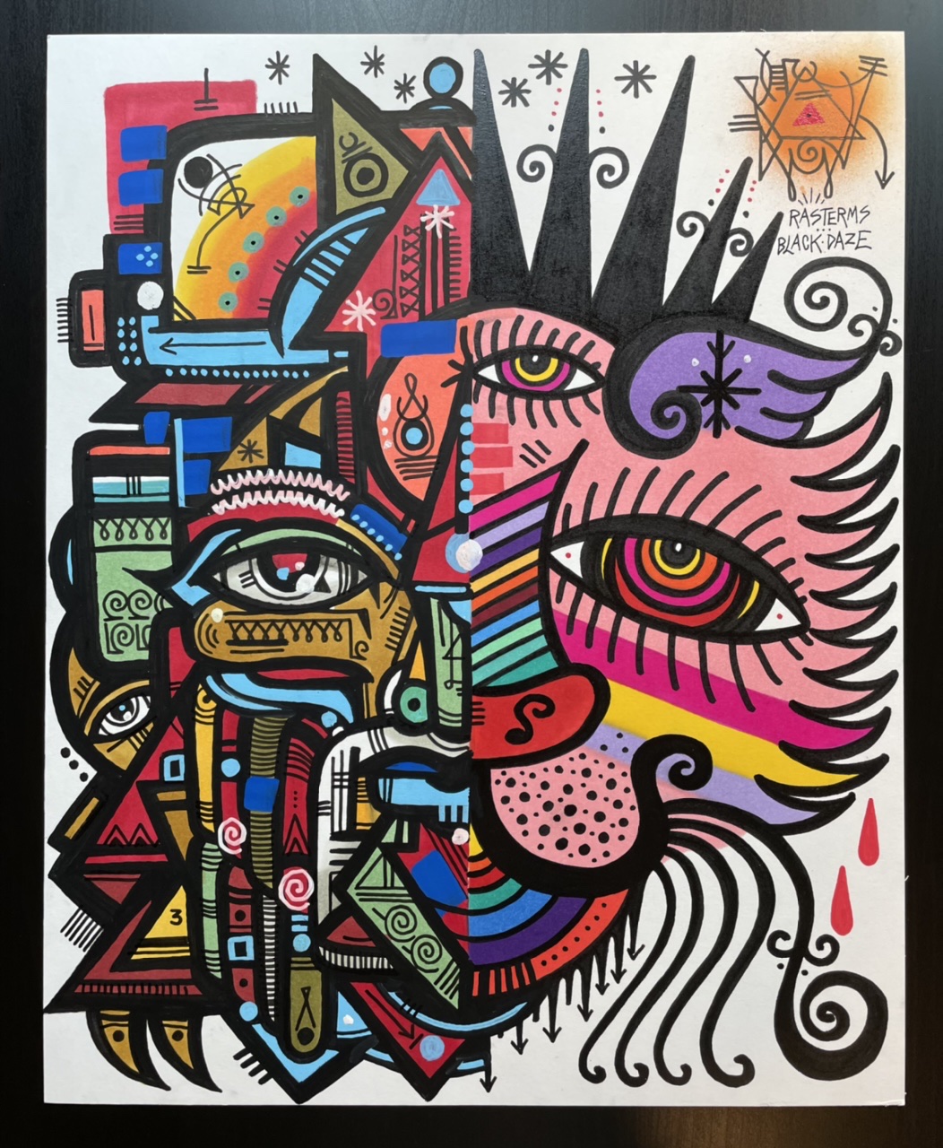RASTERMS & BLACK DAZE COLLAB ORIGINAL. MARKER ON ART BOARD. 16 X 20 INCHES. HAND SIGNED. COMES WITH STICKER PACK.
