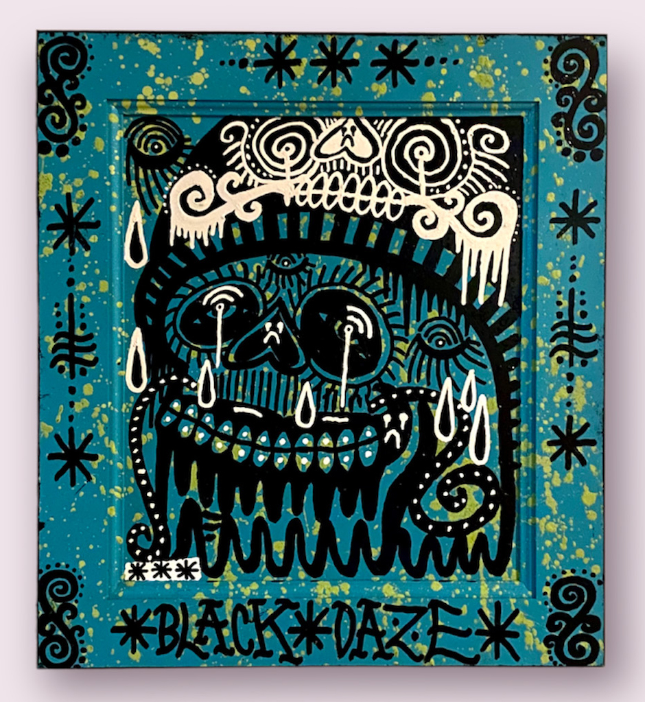 SPRAY PAINT & MARKER ON WOOD PANEL. 15 X 17 INCHES. COMES WITH STICKERS.