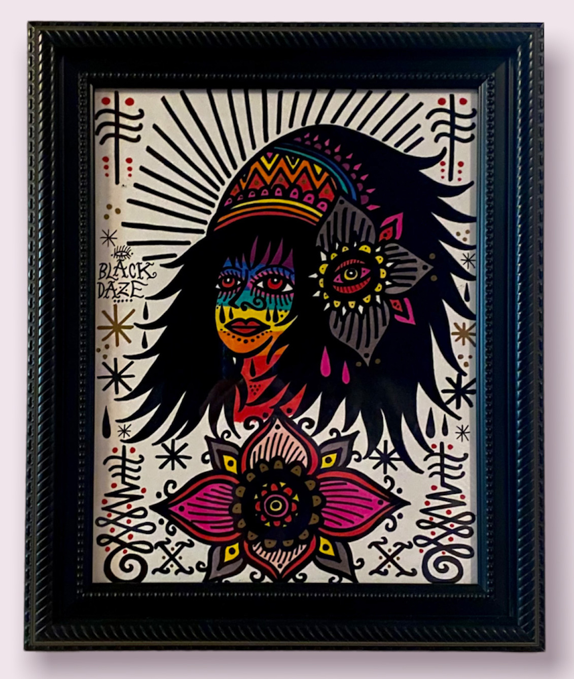 MARKER ON ART BOARD. FRAMED. 14 X 17 INCHES. COMES WITH STICKERS.