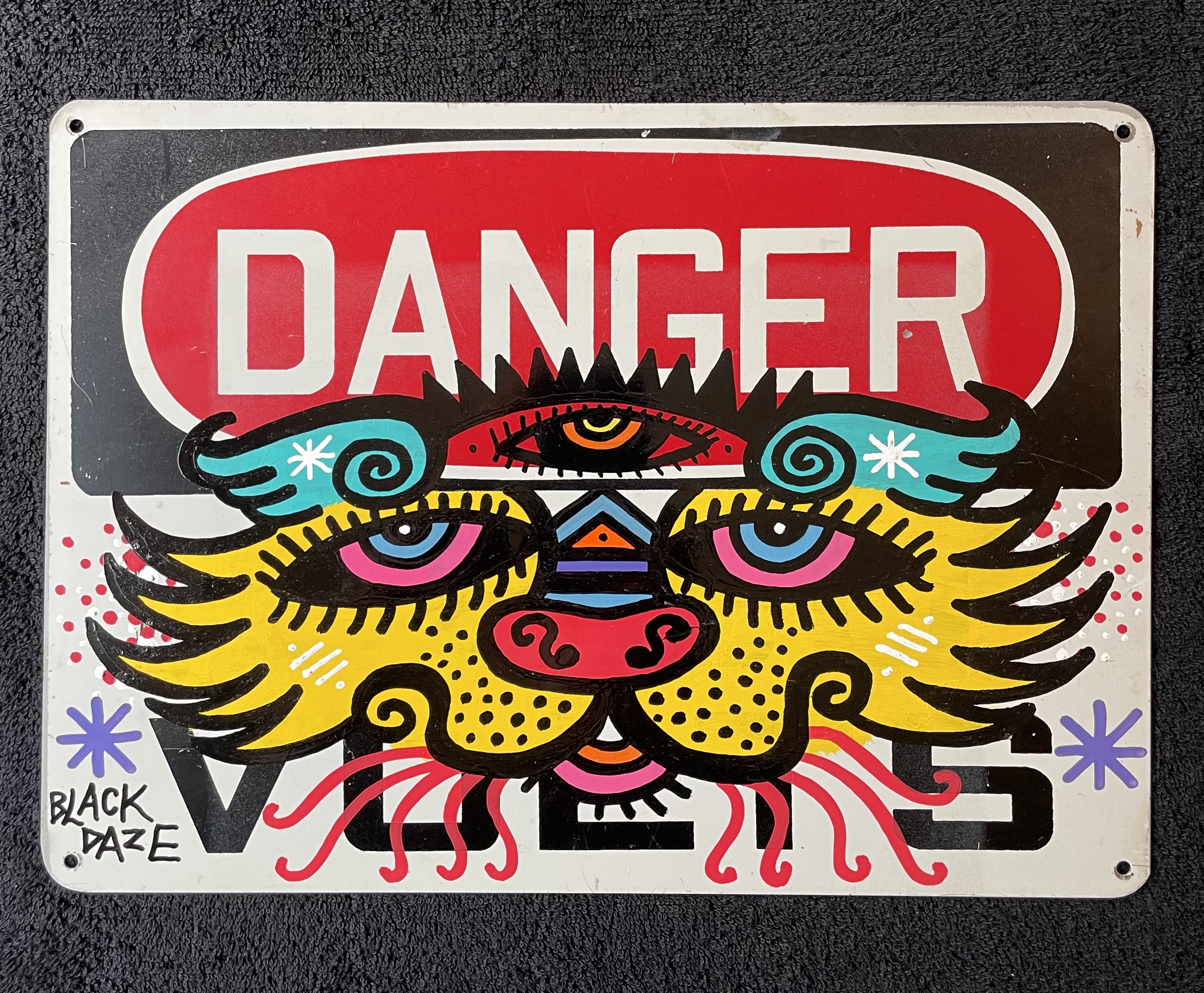 ACRYLIC & MARKER ON DANGER SIGN. 10 X 14 INCHES. HOLES FOR EASY HANGING. COMES WITH STICKERS.