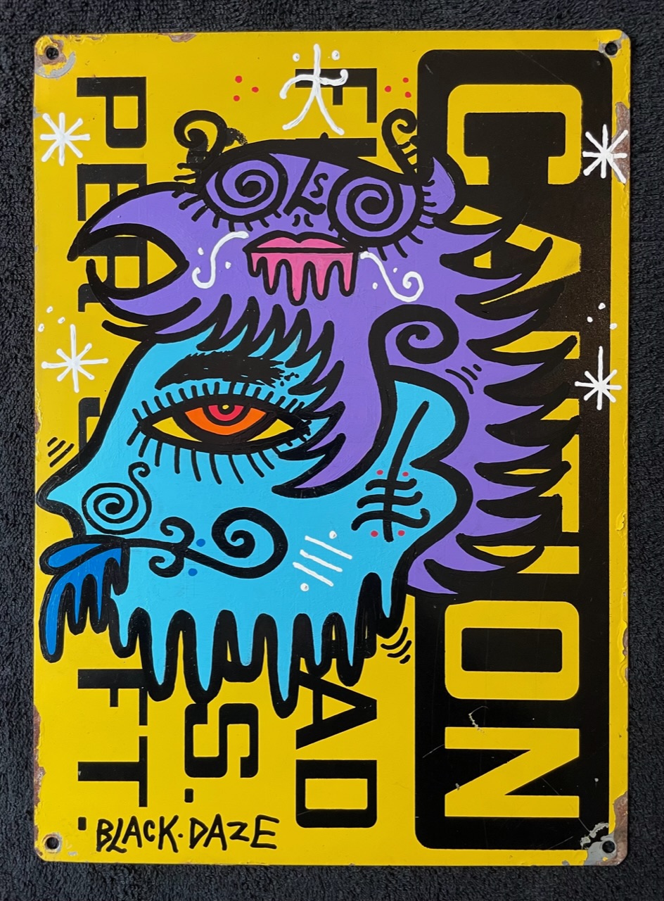 ACRYLIC & MARKER ON CAUTION SIGN. 10 X 14 INCHES. HOLES FOR EASY HANGING. COMES WITH STICKERS.