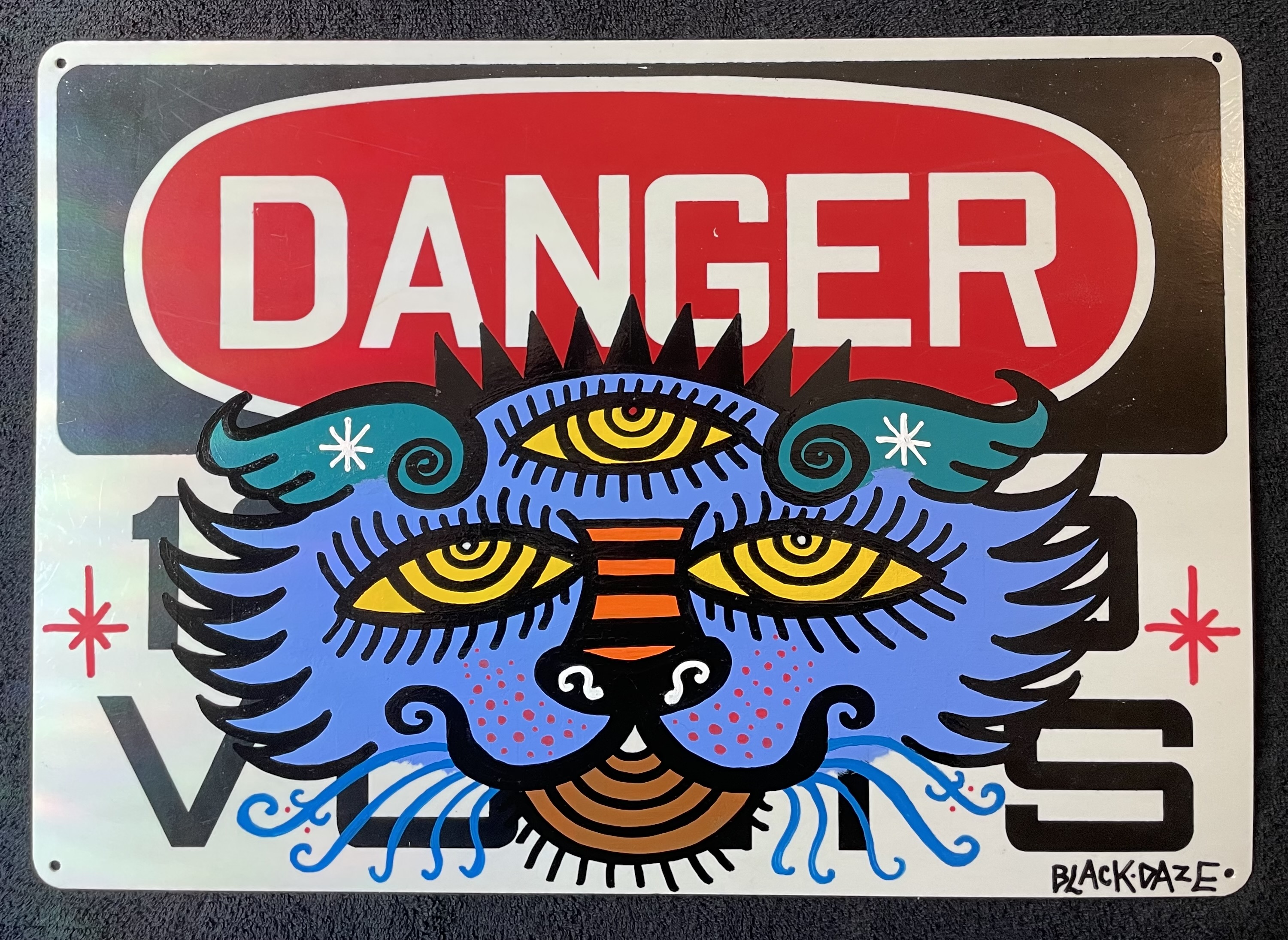 ACRYLIC & MARKER ON DANGER SIGN. 14 X 20 INCHES. HOLES FOR EASY HANGING. COMES WITH STICKERS.