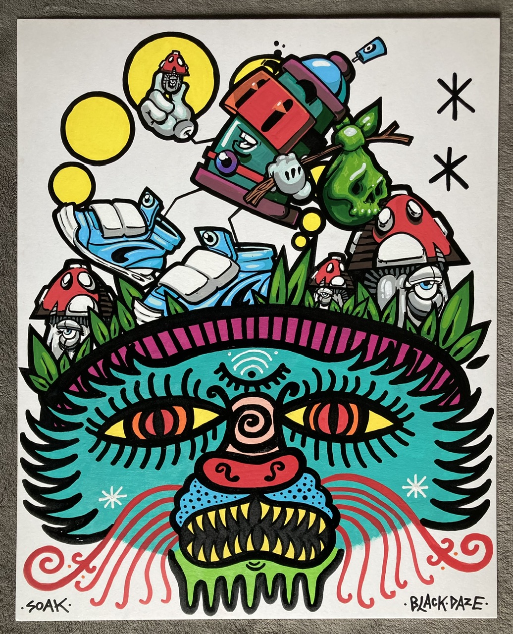 SOAK & BLACK DAZE COLLAB ORIGINAL. ACRYLIC & MARKER ON ART BOARD. 16 X 20 INCHES. HAND SIGNED. COMES WITH STICKER PACK.